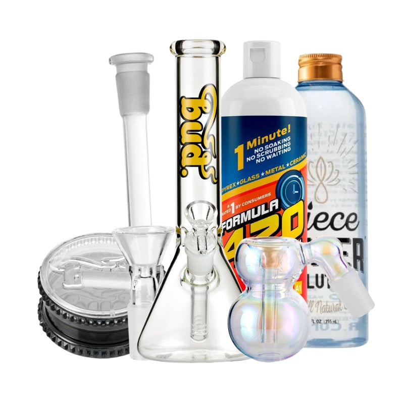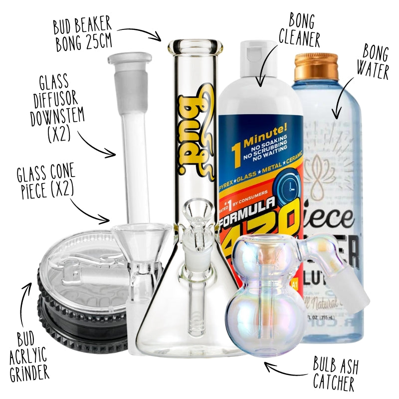 The Bud Beaker Bong 25cm Bundle - Extra Large is everything you need for a cheap, reliable and smooth smoke. This bundle includes one Bud Beaker Bong 25cm, one Tab Handle Glass Cone Piece 14mm, one Glass Diffusor Downstem 14mm, one iridescent Bulb Ash Catcher 14mm, one bottle of Piece Water Solution - All Natural Bong Water & Cleaner Alternative (355ml), one bottle of Formula 420 - Original Pyrex, Glass, Metal and Ceramic Bong Cleaner - 355ml and one Bud 2-Part Acrylic Grinder 50mm - Black.