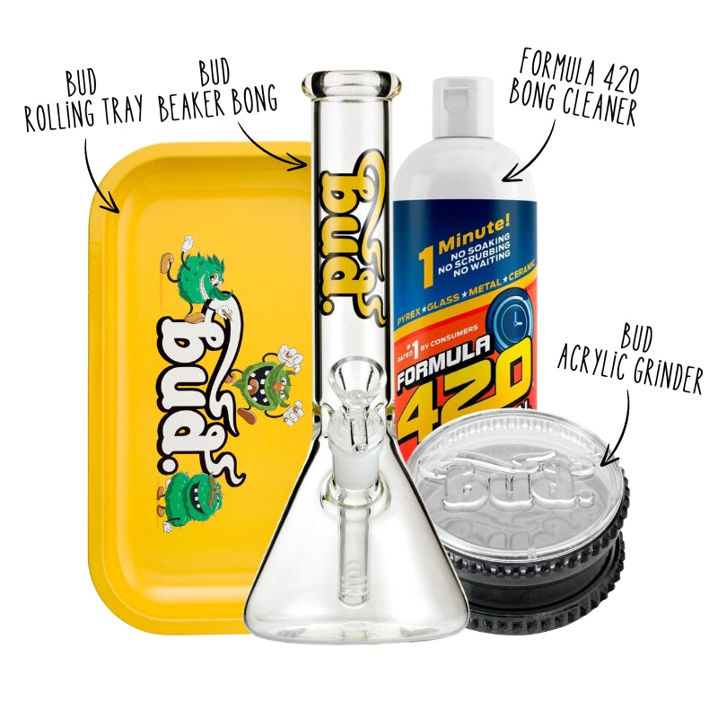 Let's not forget about the cool two-part Bud Acrylic Grinder bathed in a chic black hue and sized at a handy 50mm. To top it off, there's a bottle of Formula 420 Original Bong Cleaner to keep your new bong sparkling clean. So, whether you're a bong beginner or a thrifty veteran hunting for a stellar bundle, this is the one for you!