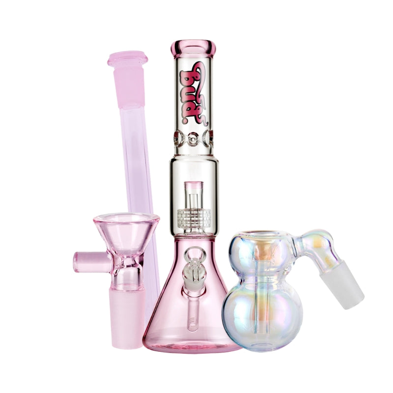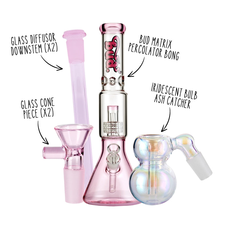 Save big while lapping up luxury pulls with the pink-coloured Bud Matrix Percolator Bong Bundle. The bundle includes everything you need for a reliable, smooth and enjoyable smoking experience while rocking a beautiful teal colour scheme. This value-for-money package includes a pink Bud Matrix Percolator Glass Bong (40cm) along with a removable glass downstem and cone piece, Iridescent Bulb Ash Catcher 14mm, Pink Tab Handle Coloured Glass Cone Piece 14mm and Pink Glass Diffusor Downstem 14mm.