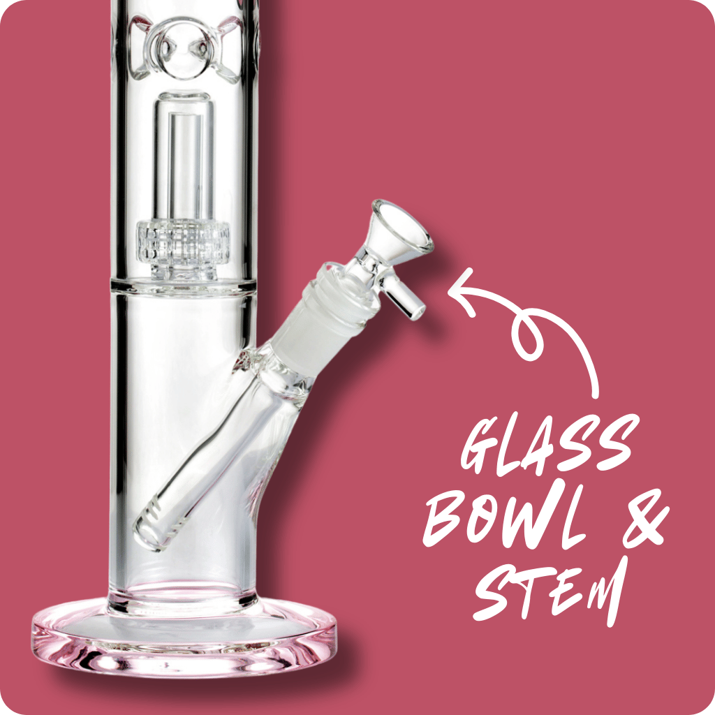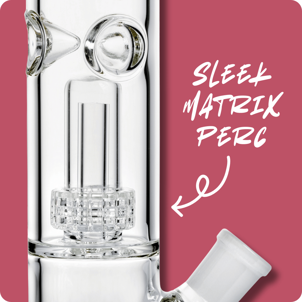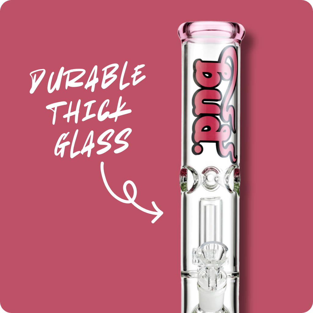 The stunning pink Bud Straight Tube Matrix Percolator Bong features a game-changing matrix percolator, delivering smoother, cleaner hits by filtering smoke through water. The percolator bong's cylindrical design with strategically placed holes ensures optimal filtration for the purest taste from your favourite herbs. Crafted from borosilicate glass, this sturdy glass bong features a stable pink base, ice notches for cooled hits and a removable cone piece and downstem.