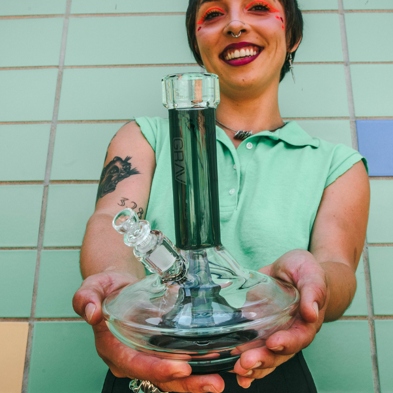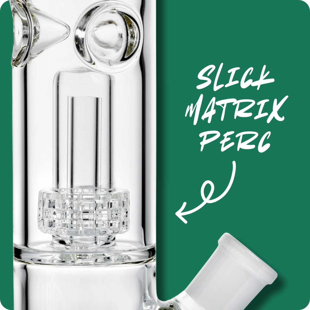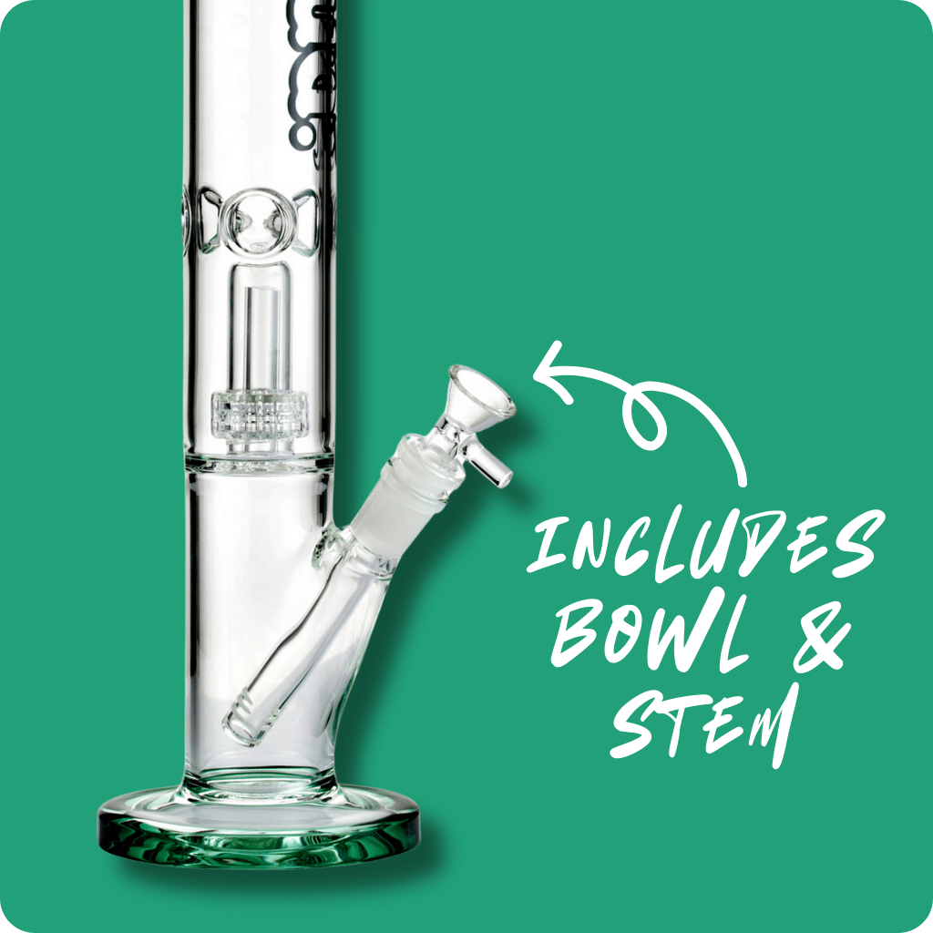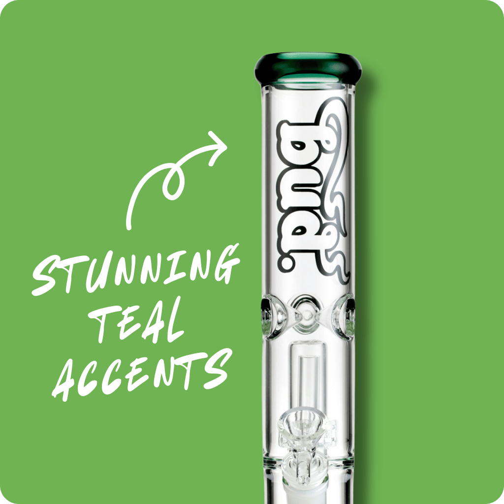 Elevate your next smoke with the stunning teal Bud Straight Tube Matrix Percolator Bong. This glass bong features a matrix percolator that filters and diffuses smoke through water, delivering smoother, more flavourful hits. The percolator's design ensures thorough filtration for the purest draws. Crafted from robust borosilicate glass, this percolator bong features a flat teal base, a spacious chamber and ice notches. Comes with a cone piece and downstem for immediate use.