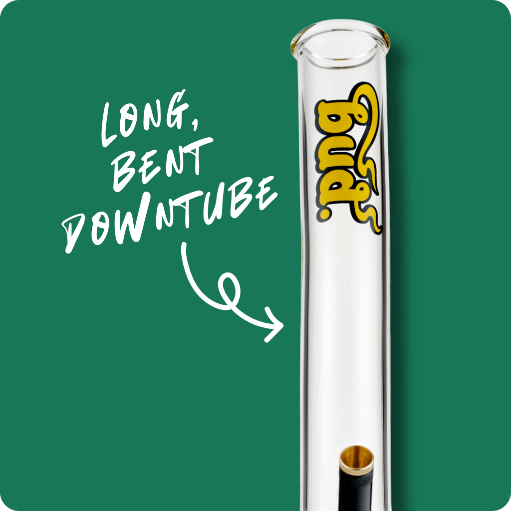 Transform your smoking sessions with the Bud Bent Bubble Bong. This 36cm Australian-designed bubble bong showcases a distinctive curved downtube and spherical water chamber. These features combined with the premium borosilicate glass construction ensures lasting durability and silky smooth hits. You'll love the authentic Aussie beug features such as the metal downstem, brass bonza cone piece and rubber base which provide airtight draws and rock-solid stability.