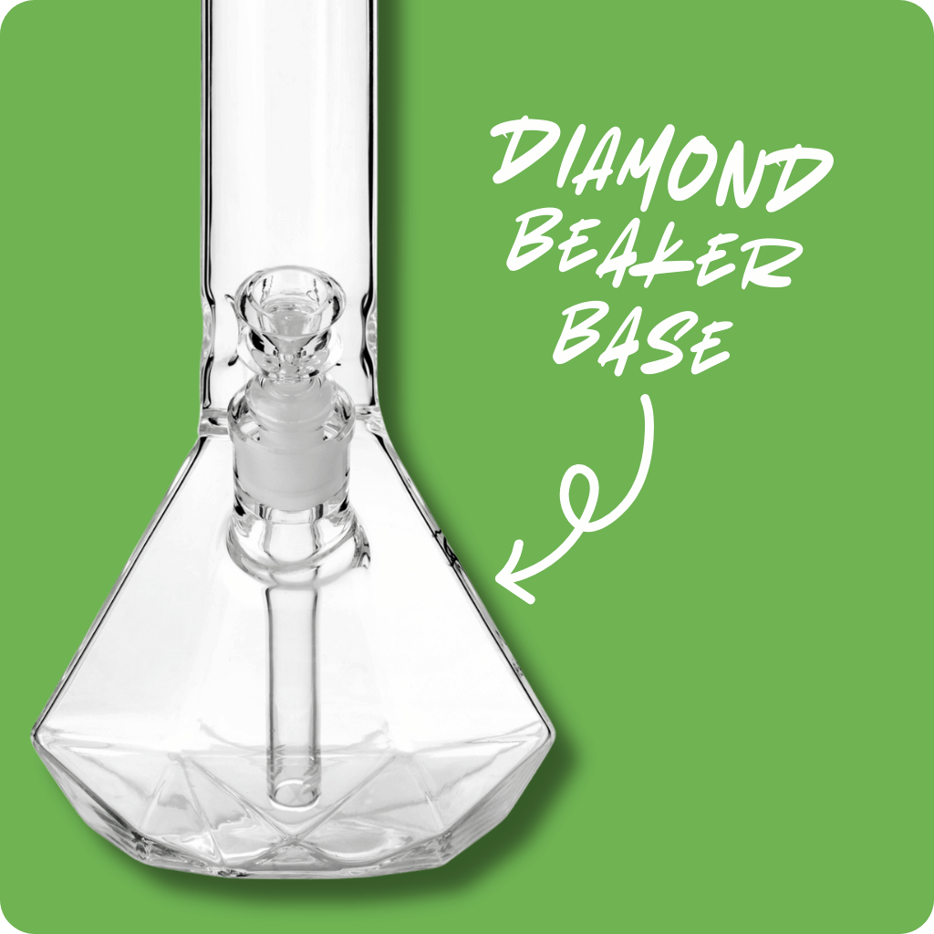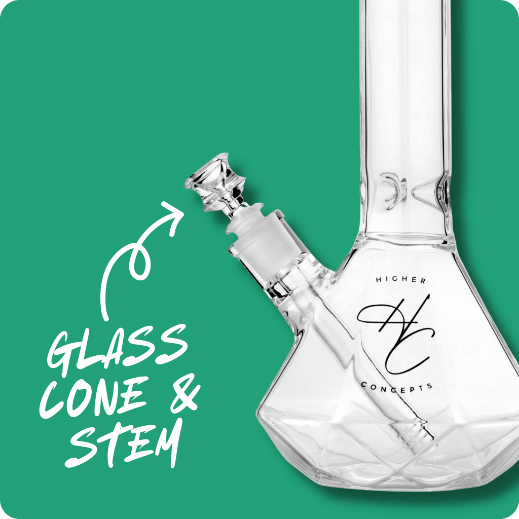 The stunning Higher Concepts Diamond Bong 33cm is a handcrafted glass bong boasting a unique diamond-shaped beaker base, offering both style and substance. Crafted from borosilicate glass, this beaker bong delivers massive hits with its generous water volume. The hexagonal downtube and ice notches enhance your grip and cool your smoke. Complete with a 14mm glass cone piece and diffusor downstem, this Australian-designed bong is ready to transform your sessions into extraordinary moments.