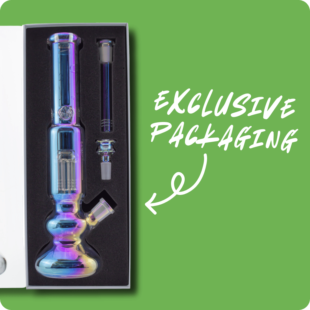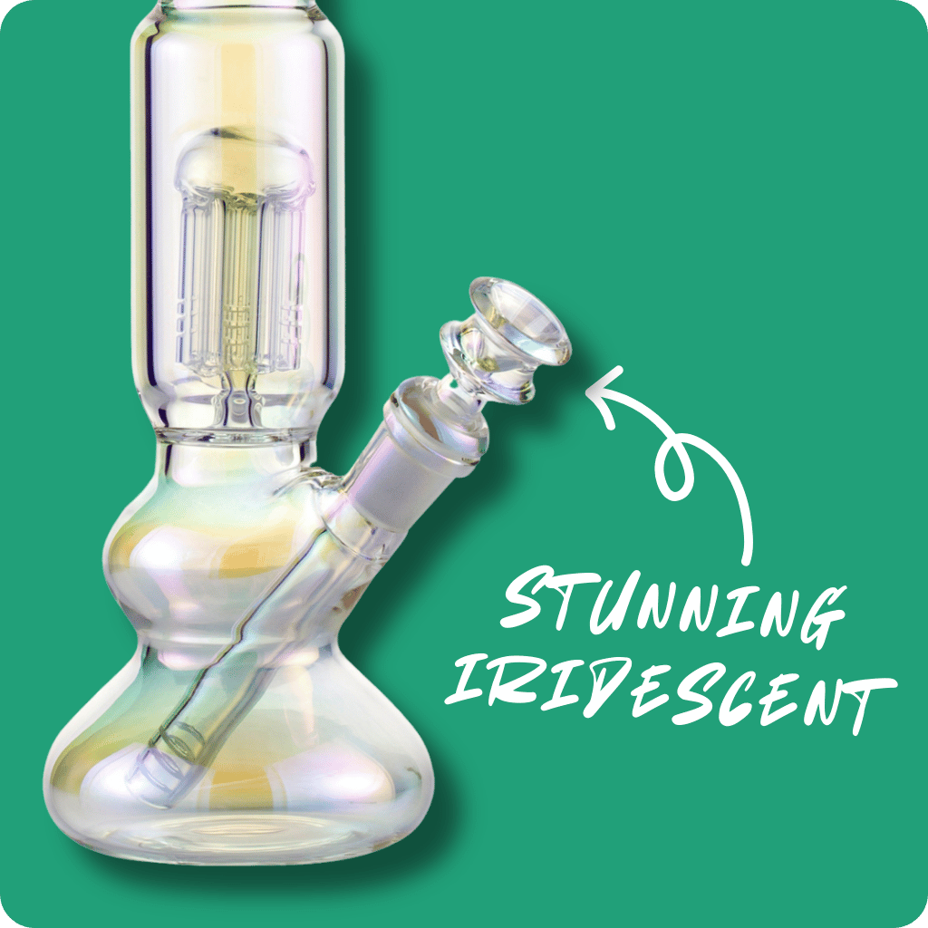 The Higher Concepts Tree Percolator Bong 33cm - Iridescent is a premium glass bong built with borosilicate glass. The stunning iridescent finish creates mesmerising rainbow reflections, while the six-arm tree percolator and three ice notches ensure silky smooth hits. The curvy chamber and wide base provide stability and ample water capacity for generous pulls. Complete with matching iridescent cone piece and diffusor downstem, this bong comes in a protective hard case.