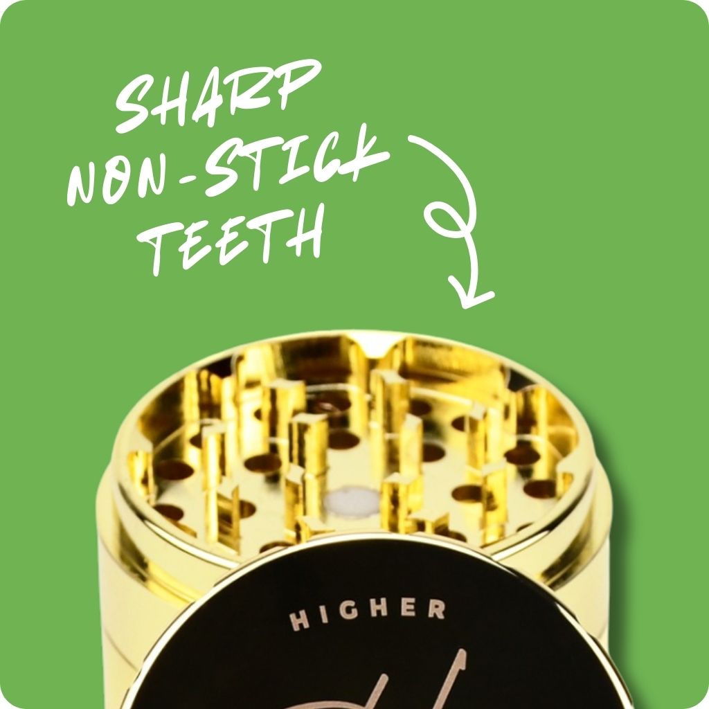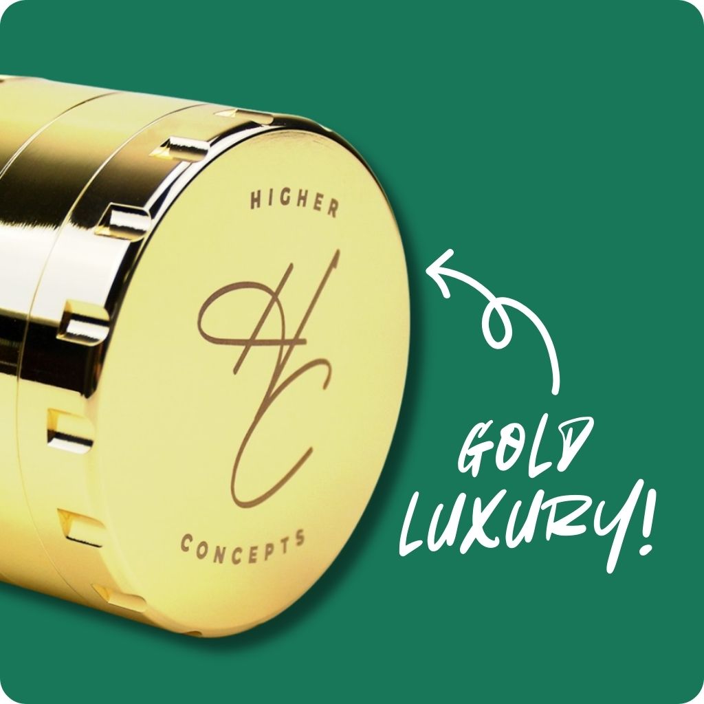 The Higher Concepts 4-Part Stainless Steel Grinder in luxurious gold is a premium weed grinder boasting a resin-resistant surface for effortless, non-stick grinding. Its expertly crafted teeth delicately process your herbs, preserving precious trichomes and unlocking a full spectrum of flavours. The four-piece construction, including a kief collector, ensures no part of your herb goes to waste. Indulge in the velvet-smooth operation and elegant design of this top-tier herb grinder today!