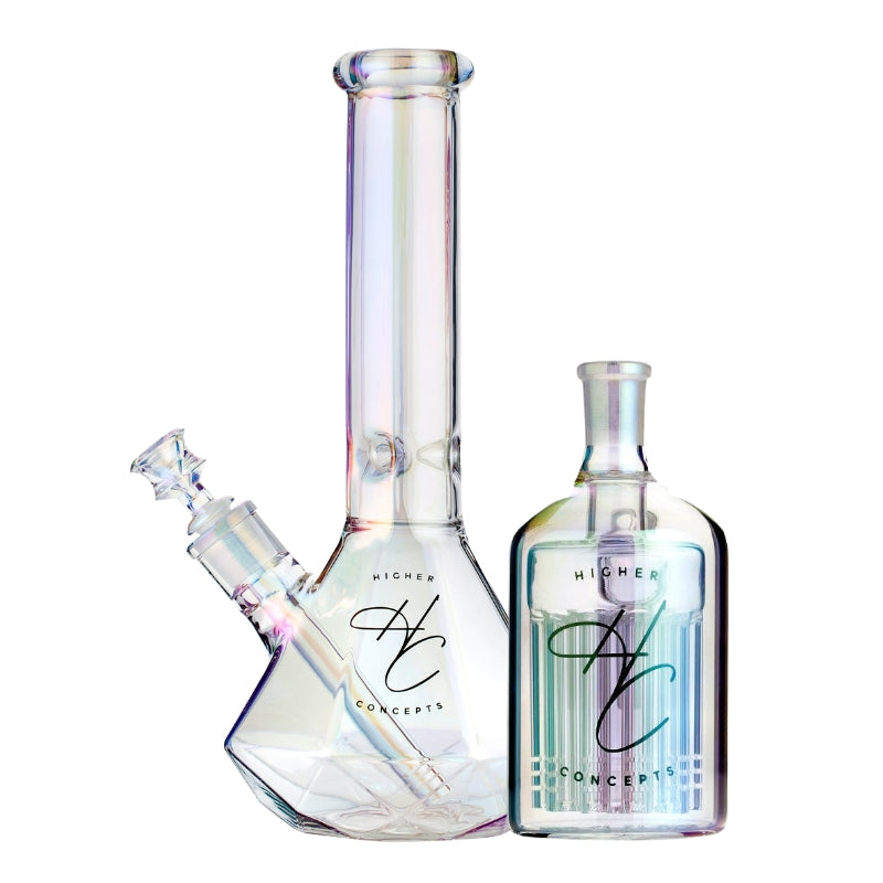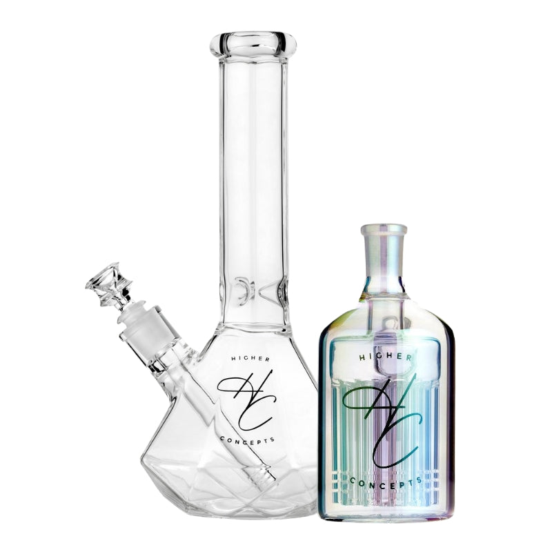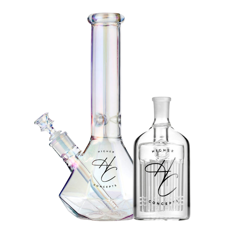 Level up your sesh with the Higher Concepts Beaker Bong & Ash Catcher Bundle. This killer combo brings together two of our top-sellers at a sweet price. You’ll get the Heavy Duty Beaker Bong 22cm and the 45° Ash Catcher 14mm, both made from thick borosilicate glass and available in either clear or a trippy iridescent finish. The small glass bong is perfect for everyday use with cool, smooth hits thanks to its ice notches, while the ash catcher keeps things clean with an 11-arm percolator. If you're after a bong setup that hits hard and looks good doing it, this is it.