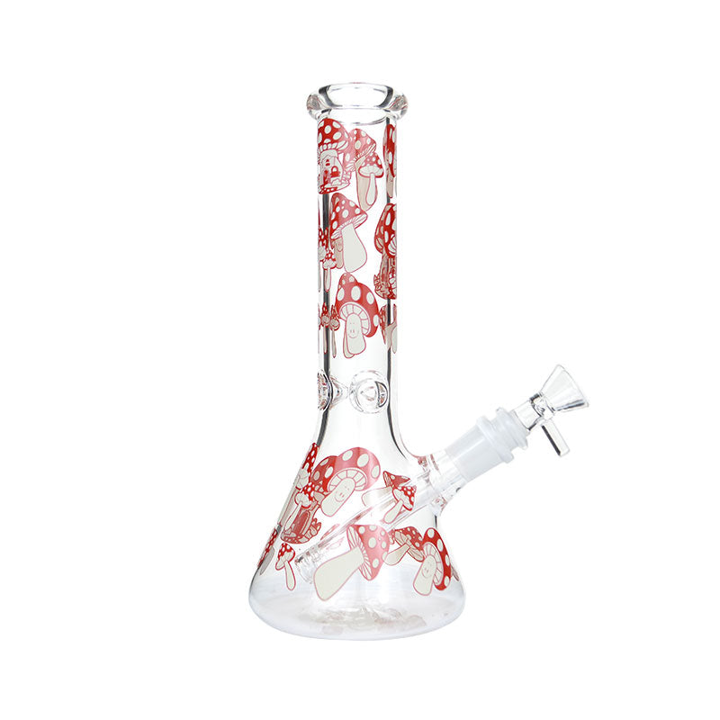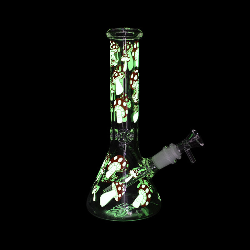 Keep it trippy, weird and wonderful with the pink-coloured Mushroom Glow In The Dark Beaker Bong. It's a medium-sized glass bong standing at 25cm and is made from thick heavy-duty borosilicate glass. It's peppered with out-of-this-world pink glow in the dark mushroom graphics from the top of the neck down to the beaker base chamber. Put it in the light for a few minutes to charge up, then place in the dark to revel in its awesome luminous glow.