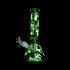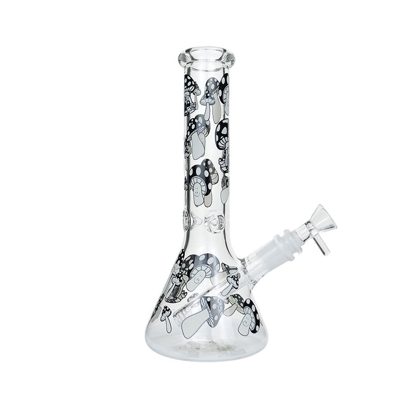 Keep it trippy, weird and wonderful with the black-coloured Mushroom Glow In The Dark Beaker Bong. It's a medium-sized glass bong standing at 25cm and is made from thick heavy-duty borosilicate glass. It's peppered with out-of-this-world black glow in the dark mushroom graphics from the top of the neck down to the beaker base chamber. Put it in the light for a few minutes to charge up, then place in the dark to revel in its awesome luminous glow.